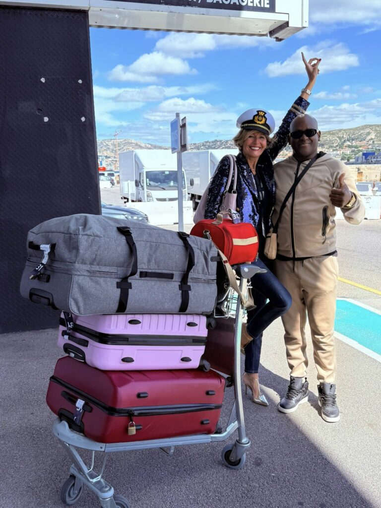 Moi, la pin-up parisienne assumée, je voulais débarquer à Marseille avec panache : veste dorée façon commandant, casquette assortie, talons dorés. La plupart des passagers optaient pour un look plus décontracté – jean, baskets, jogging. Mais que voulez-vous… on ne se refait pas.