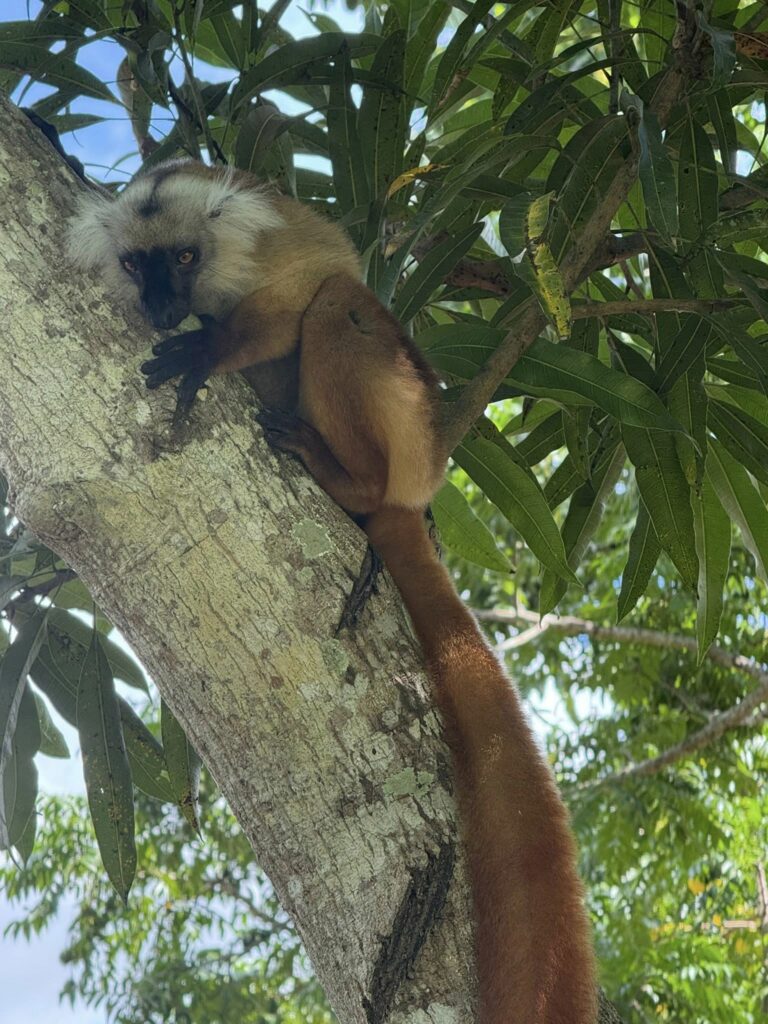 Et soudain, entre les branches… des lémuriens. Un mâle noir. Une femelle à la queue rousse. Un moment de grâce.