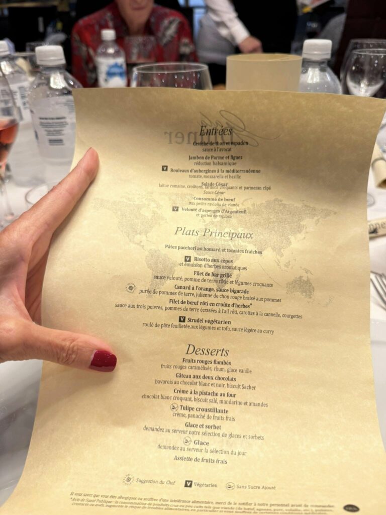 Le dîner fut simple au 13e, en compagnie d’une passagère rencontrée en excursion. Une conversation agréable sur nos ressentis, nos voyages, la croisière…